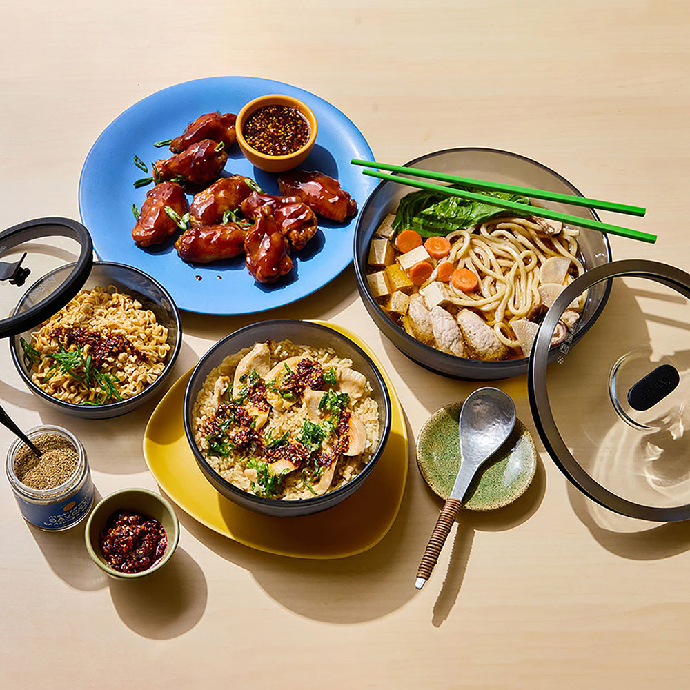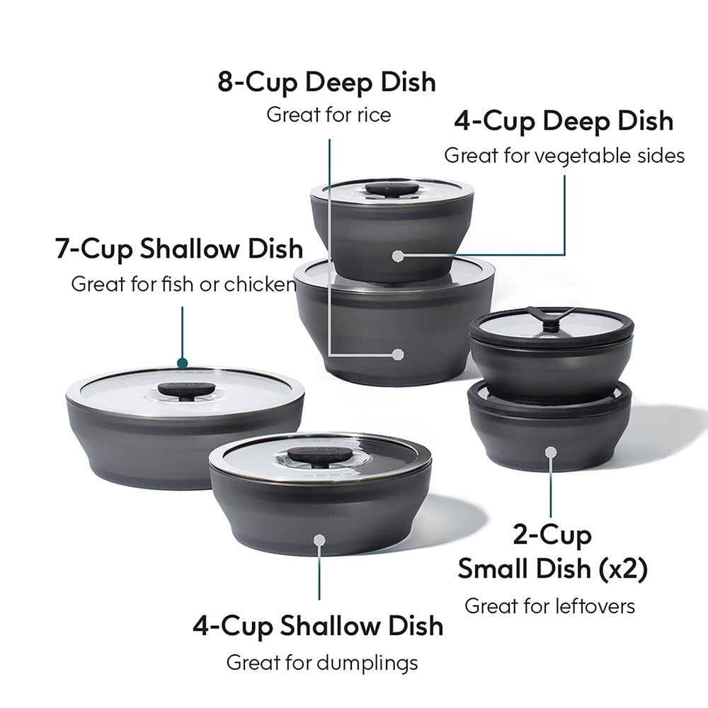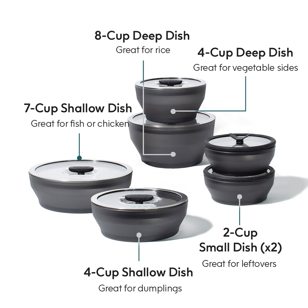Build your plastic-free kitchen with Anyday's limited edition matte black frosted glass collection designed in collaboration with Momofuku chef and founder David Chang. Designed as versatile microwavable cookware, these durable frosted glass dishes also double as food storage containers with vented glass lids. Ideal for reheating leftovers, cooking from frozen or steaming meals from scratch, these dishes will help you create your favorite recipes in a fraction of the time of other cooking methods.