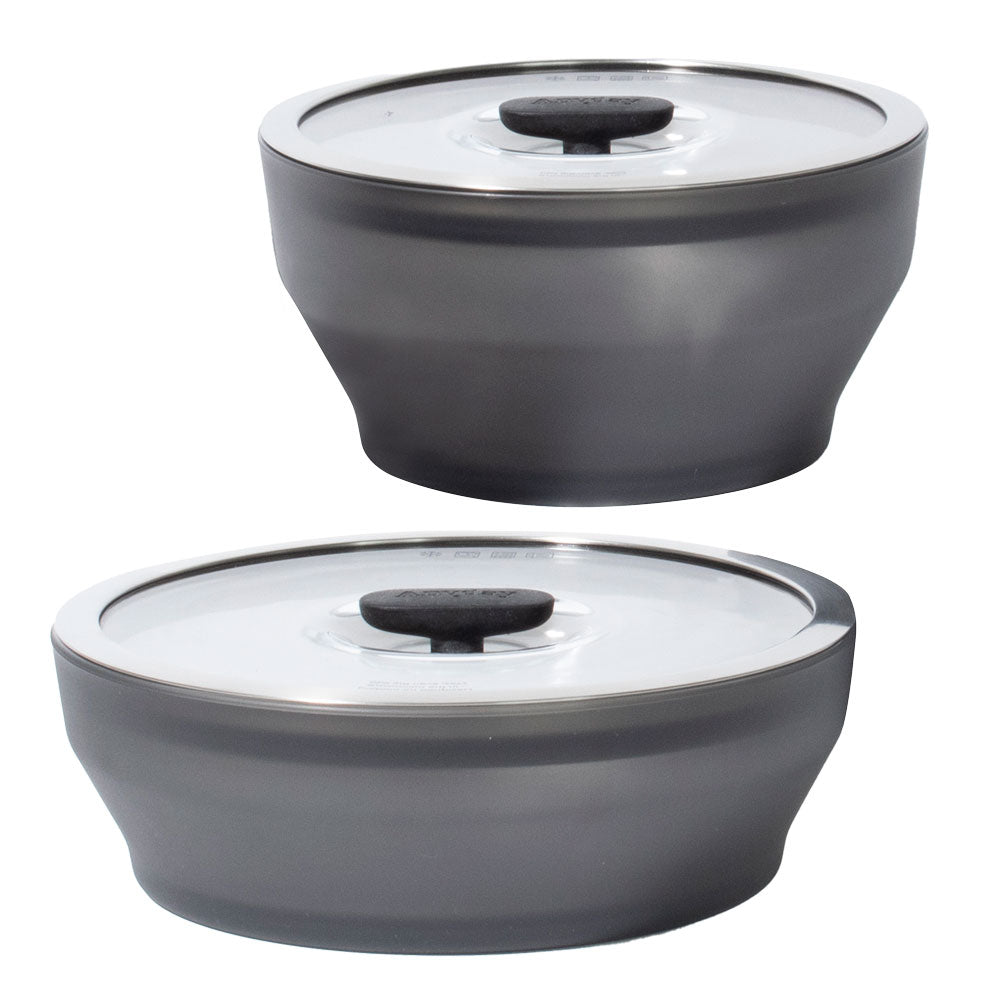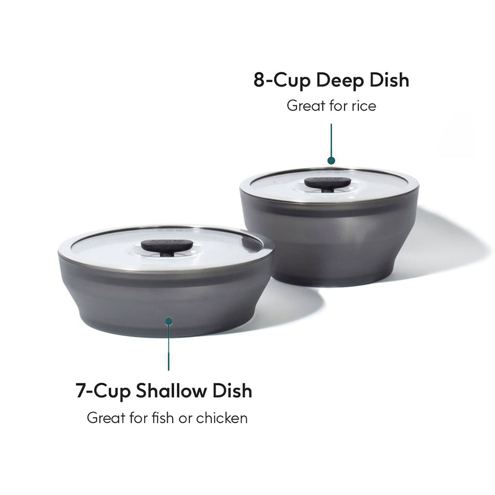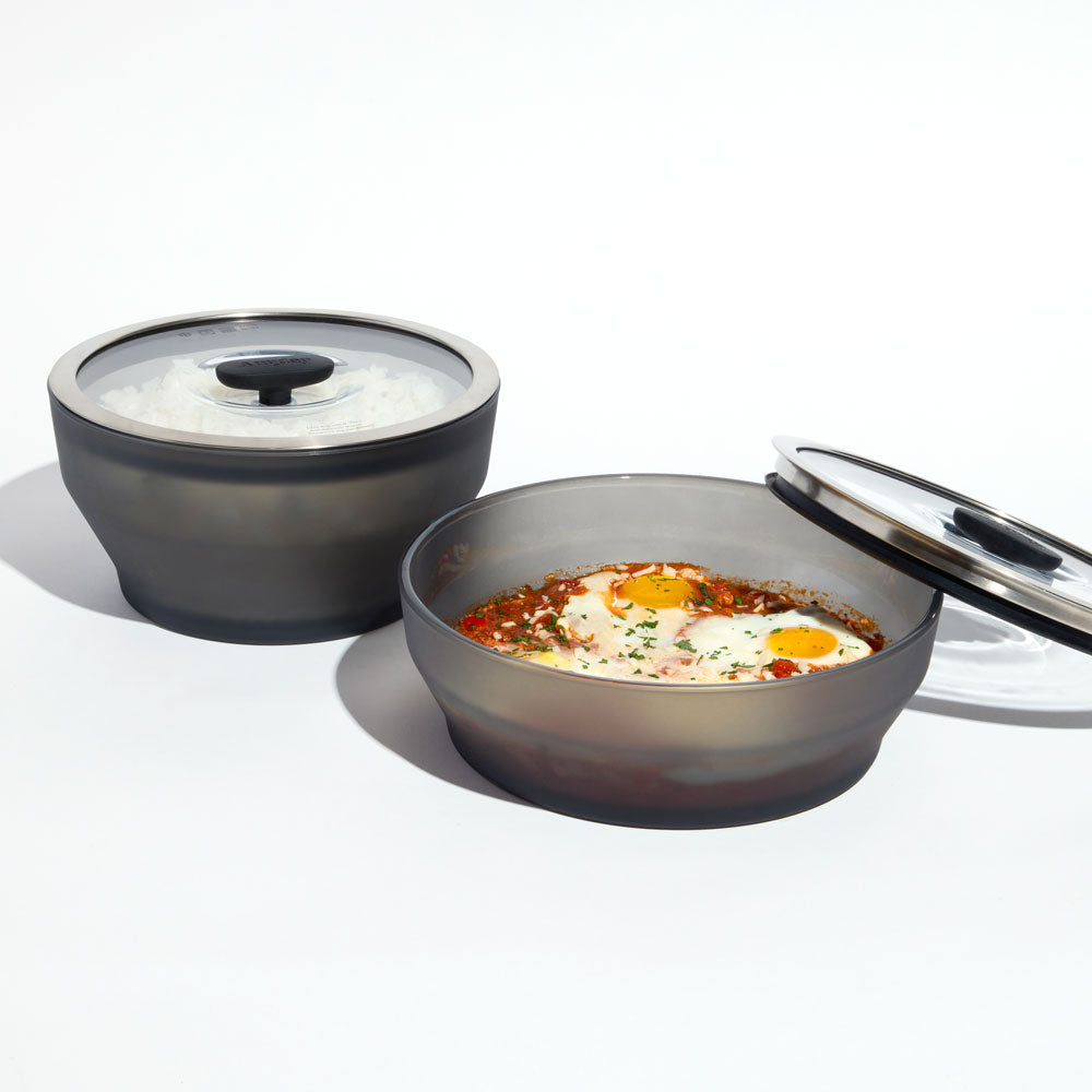 Build your plastic-free kitchen with Anyday's limited edition matte black frosted glass collection designed in collaboration with Momofuku chef and founder David Chang. Designed as versatile microwavable cookware, these durable frosted glass dishes also double as food storage containers with vented glass lids. Ideal for reheating leftovers, cooking from frozen or steaming meals from scratch, these dishes will help you create your favorite recipes in a fraction of the time of other cooking methods. Each lid in this set is reinforced with a microwavable stainless-steel rim that will stand the test of time.